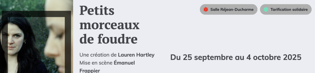 Chez Duceppe, MARIE-ÈVE MILOT (2005) signe la mise en scène de « Rue Duplessis/Ma petite noirceur », adaptation du roman de Jean-Philippe Pleau. La pièce est présentée du 3 septembre au 4 octobre 2025. Le collègue MICHEL-MAXIME LEGAULT incarne l’alter ego de l’auteur.
